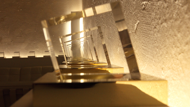 アクリルスツール「la terra trasparente」をミニチュアにしたフォトフレーム。金属ベースのくぼみに置いた写真はアクリルキューブの上面にしか映らない。側面からは全く見えず、周囲の景色を映し込むかもしくは透過して見えるだけである。